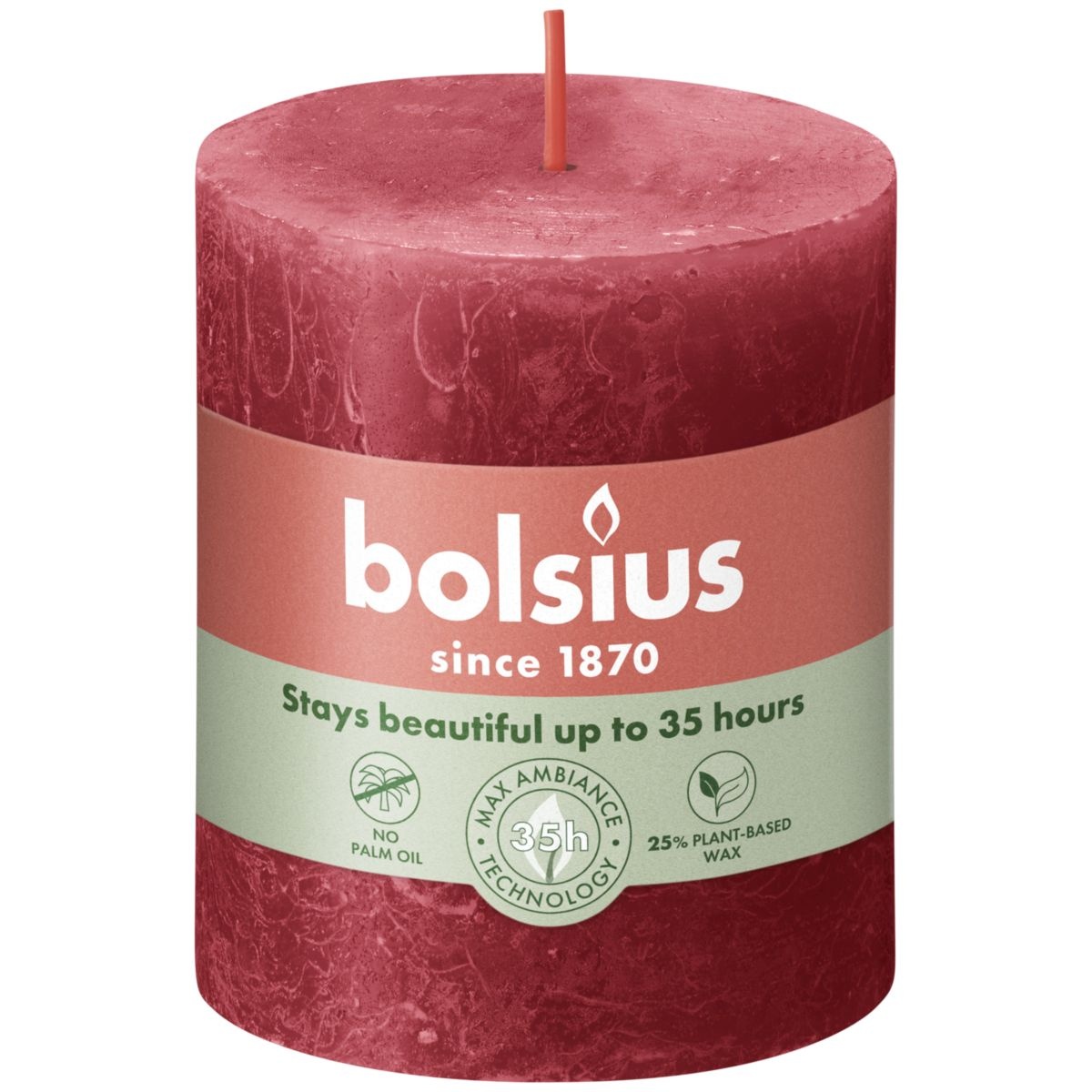 De Bolsius rustieke stompkaars in de donkerrode kleur Delicate Red is 8cm hoog en brandt wel 35 uur.Een absolute en tijdloze klassieker: Delicate Red is rood zoals rood moet zijn. Intens, verleidelijk en sensueel!