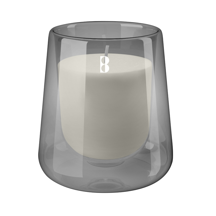 De Bolsius CleanLight starterkit bevat een handgeblazen glazen houder en de navulbare geurkaars ‘Cypress & Amber’.